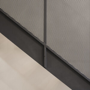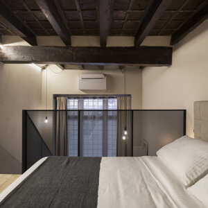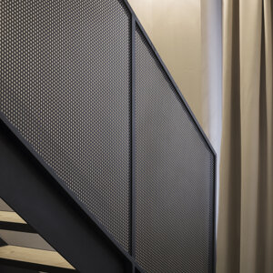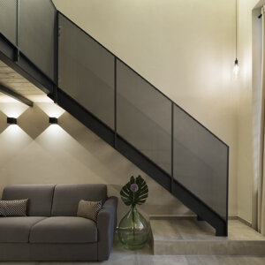 L'appartamento si articola in due livelli per mezzo di un soppalco in ferro color antracite e un tavolato in legno. La scala ed il parapetto in lamiera forata diventano l' elemento caratterizzante dell'ambiente, introducono una nota di industrial design alla composizione.