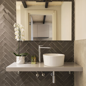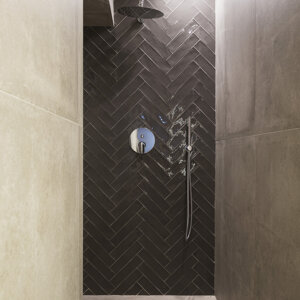 Le linee eleganti ed essenziali proseguono nel bagno, anch'esso fortemente caratterizzato dall'illuminazione artificiale e dalla grande doccia a pioggia.