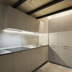 L'illuminazione naturale è garantita da un'ampia vetrata prospiciente il portico, mentre l'illuminazione artificiale crea scenari differenti adatti alle diverse circostanze, lampade a sospensione dallo stile industriale arredano l'ambiente, piccolo spot disegnano la parete, e lame di luce inondano l'ambiente di luce.