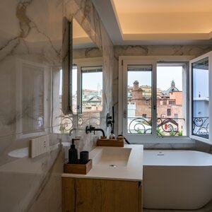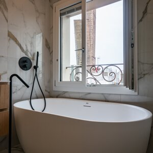 Le scelte progettuali di pavimenti, rivestimenti ed arredi creano un’atmosfera elegante, conservando e valorizzando però le caratteristiche architettoniche dell’abitazione, la luce che penetra dalle ampie finestre rende l’ambiente personale e caldo.