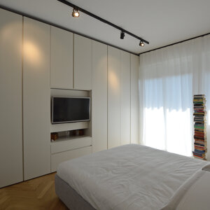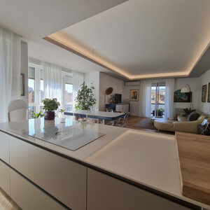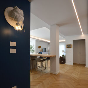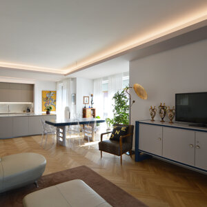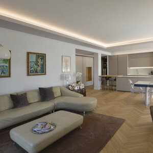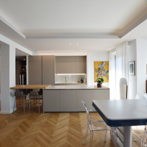 L'appartamento allo stato originale si presentava fortemente frazionato, con numerosi spazi di disimpegno e pochi ambienti piacevolmente fruibili. Il progetto intende dunque liberare lo spazio creando una zona open space dedicata alla cucina e al living. Il design che caratterizza questi ambienti è moderno e caratterizzato da grandi aperture che permettono l’introduzione della luce naturale che impreziosisce lo spazio.