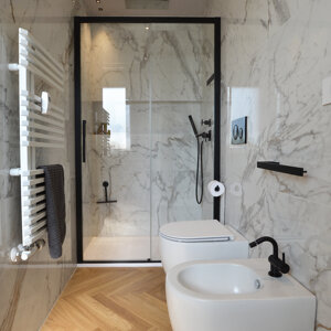 La zona notte destinata al committente è caratterizzata da una camera matrimoniale dotata di un bagno privato e questi ambienti sono delineati dalla luce e dal design moderno delle linee, dai materiali e dall’arredamento. Il bagno è caratterizzato dalle tonalità calde del marmo posto a parete e presenta un parquet a pavimento in continuità della camera matrimoniale.