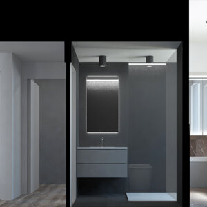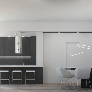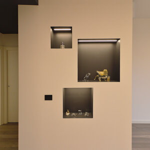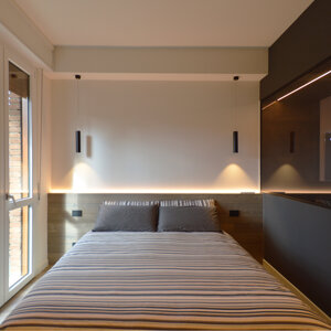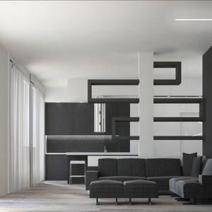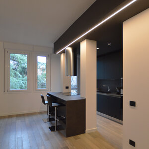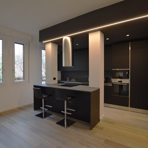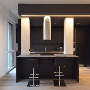 Il progetto prevede il rinnovamento e la valorizzazione di un immobile appartenuto alla famiglia del giovane committente, con lo scopo di adattarlo alle sue esigenze specifiche. L'appartamento allo stato originale si presentava fortemente frazionato, con numerosi spazi di disimpegno e pochi ambienti piacevolmente fruibili. Il progetto intende dunque liberare lo spazio creando una zona open space dedicata alla cucina e al living. Il design che caratterizza questi ambienti è moderno e caratterizzato da tonalità scure, poste a contrasto con elementi bianchi e col parquet a pavimento. La luce impreziosisce lo spazio.