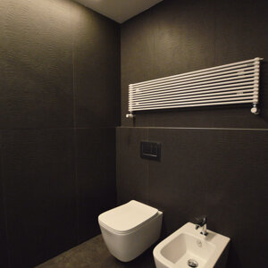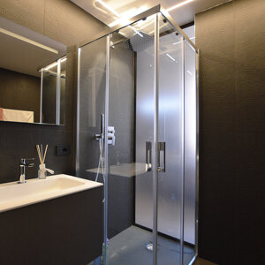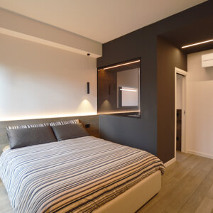 La zona notte destinata al committente è concepita come una suite, dotata di cabina armadio e di un bagno privato con vasca idromassaggio. La camera è posta in totale connessione col bagno privato mediante un'ampia apertura vetrata, una peculiarità che si ripete anche nella connessione tra il bagno principale e quello privato, dove la parete vetrata della doccia è anche la partizione divisoria tra i due ambienti. La zona notte è delineata dalla luce e dal design moderno delle linee, dei materiali e dell'arredamento, la testata del letto è costituita in continuità col pavimento ed è animata da una linea led che la percorre, il bagno privato è caratterizzato dalle tonalità calde del marmo amani posto sia a parete che a pavimento, mentre il bagno principale riprende le tonalità scure della zona giorno.