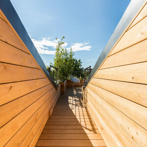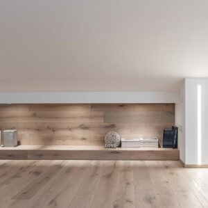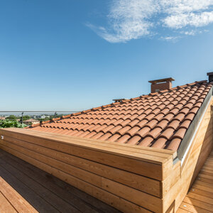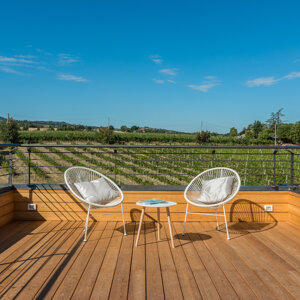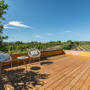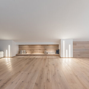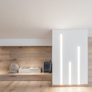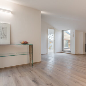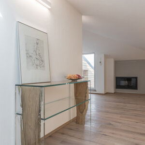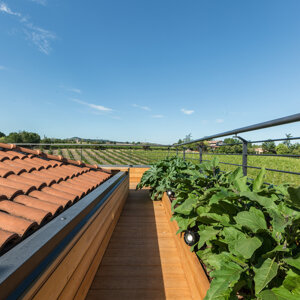 L'intervento prevede la ristrutturazione e la valorizzazione di un attico, con lo scopo di adattare l'abitazione alle nuove esigenze della famiglia. L'appartamento si sviluppa su due livelli ed il sottotetto collega gli ambienti interni a due grandi terrazze panoramiche. I locali prima della ristrutturazione si presentavano insufficientemente illuminati ed opprimenti. Proprio l’illuminazione, così carente diventerà la nota caratterizzante dell’appartamento. Si è deciso di lavorare sia con l’illuminazione naturale che con quella artificiale, per rendere gli ambienti confortevoli a tutte le ore del giorno. Grandissimi lucernari assemblati a gruppi per creare aperture di 3 x 3 metri e 2x1,5 m inondano di luce gli ambienti, esaltando il parquet dai toni chiari e le pareti bianche e grigio perla. Un camino a pellet regala l’atmosfera calda per una grande zona di relax. L’illuminazione artificiale, quasi invisibili durante il giorno perché integrata nella muratura, al crepuscolo si accende e diventa estremamente scenografica, caratterizzando in modo deciso gli ambienti. Tutto è gestito dalla domotica e regolabile in intensità, per adattarsi ai diversi utilizzi della casa. Altro tema centrale della progettazione riguarda gli esterni dell’appartamento. Due terrazze panoramiche, poco utilizzate e senza una funzione definita, sono state completamente trasformate e rese il punto di forza dell’abitazione. La più grande delle due, interamente rivestita in legno, diventerà luogo di relax per la famiglia e gli amici, dove poter cucinare e mangiare all’aperto, oltre che godere del panorama seduti su comodi divani. Grandi fioriere realizzate in opera portano il verde della campagna circostante all’interno dell’abitazione. Melograni, graminacee ornamentali ed erbe aromatiche circondano le sedute e si sposano con la vegetazione circostante. Il terrazzo più piccolo, con funzioni più private, sarà luogo di studio e lettura all’aperto per i bambini ed adulti e conterrà una grande vasca adibita ad orto, in grado di produrre tutto ciò che serve al nucleo familiare.