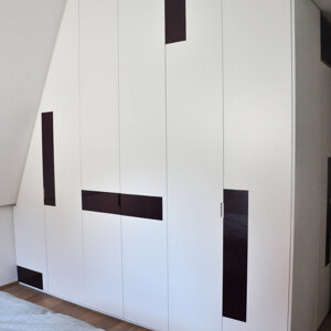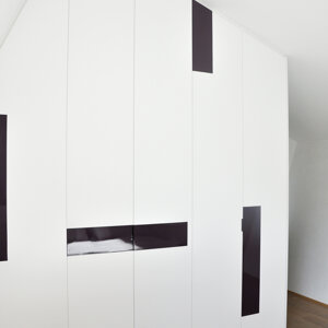 Vista la particolarità della struttura con pareti e tetto inclinati tutti gli arredi sono stati disegnati e realizzati su misura, per sfruttare al meglio lo spazio ed esaltarne le peculiarità.